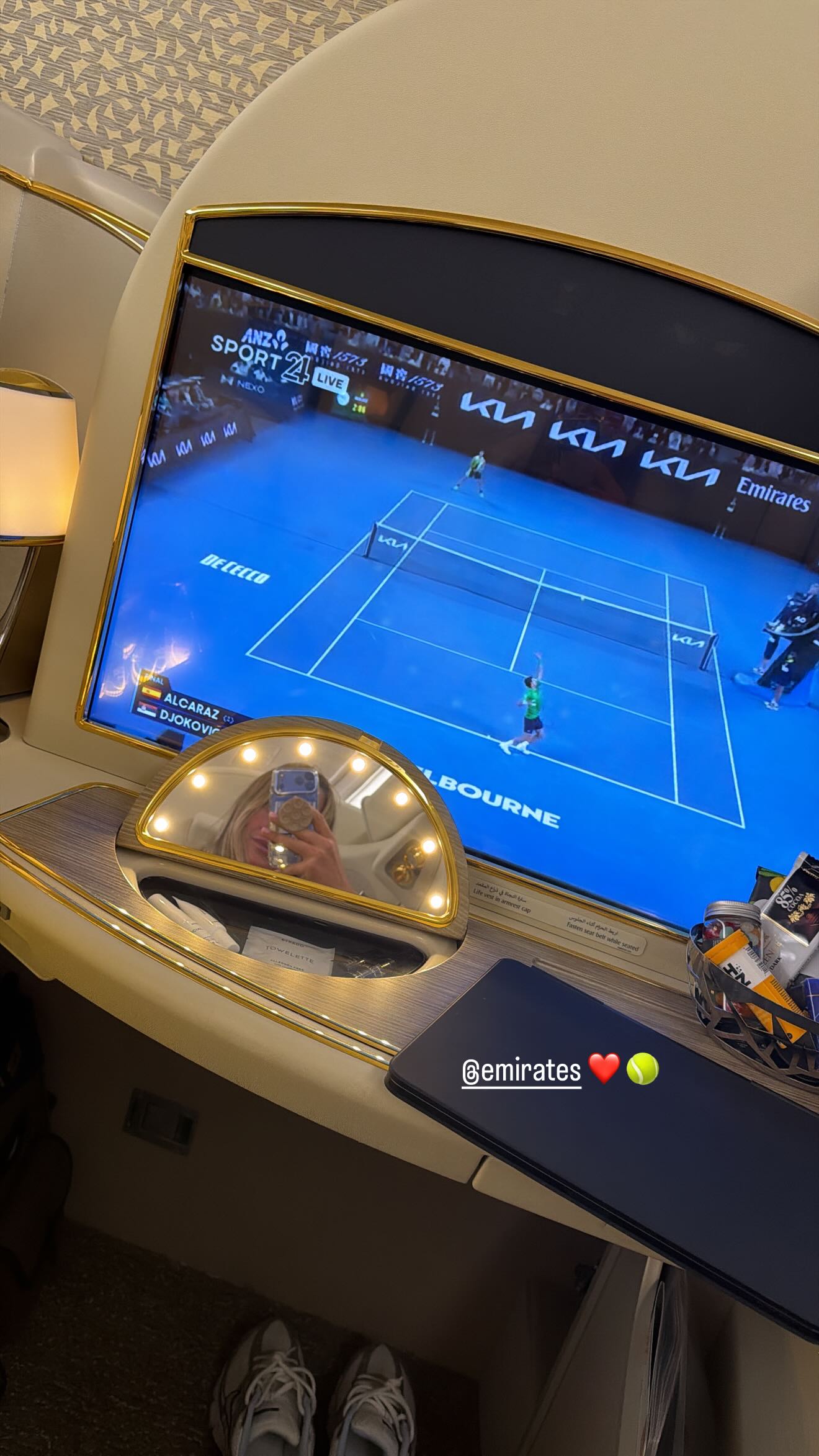 Первая ракетка планеты из Беларуси и четырехкратная чемпионка турниров «Большого шлема» Арина Соболенко выложила в соцсетях фото из самолета, в котором смотрела финал Australian Open-2026 между испанцем Карлосом Алькарасом и сербом Новаком Джоковичем. Алькарас одержал победу со счетом 2:6, 6:2, 6:3, 7:5.
