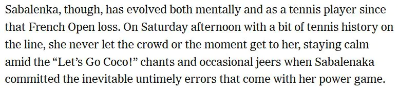 Однако с момента того поражения на Открытом чемпионате Франции Соболенко значительно изменилась как в психологическом плане, так и как теннисистка. В субботу, когда на кону стояла важная часть теннисной истории, она не позволила толпе или эмоциям повлиять на нее, сохраняя спокойствие среди криков «Вперед, Коко!» и редких насмешек, когда Соболенко совершала неизбежные ошибки, свойственные ее мощной игре, — отмечает журналист.