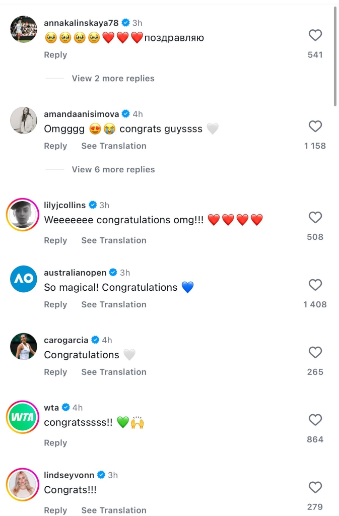 Так, среди поздравивших пару уже отметились 24-кратный чемпион турниров «Большого шлема» серб Новак Джокович, первая ракетка мира испанец Карлос Алькарас, российская теннисистка Анна Калинская, американка Аманда Анисимова и многие другие.