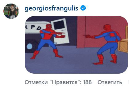 Бойфренд Соболенко, бразильский бизнесмен и автогонщик Георгиос Франгулис, оставил под постом Бадосы картинку-мем с двумя выясняющими кто есть кто героями в костюме Человека-паука.
