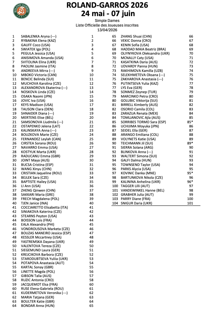 Объявлен список участников женской сетки «Ролан Гаррос» — 2026 в одиночном разряде. Заявку на участие в грунтовом турнре «Большого шлема» подтвердила и первая ракетка мира белоруска Арина Соболенко.