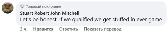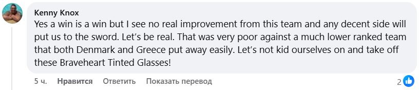 — Да, победа есть победа, но я не вижу никаких реальных улучшений у этой команды. И любая приличная команда нас разгромит. Давайте будем реалистами. Это был очень слабый матч против команды гораздо более низкого рейтинга, которую и Дания, и Греция легко разобрали. Давайте не будем обманывать себя и снимем эти очки храброго сердца!