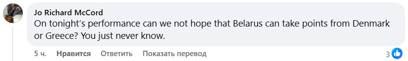 — Учитывая сегодняшнее выступление, разве мы не можем надеяться, что Беларусь сможет отобрать очки у Дании или Греции? Никогда не знаешь, что будет.