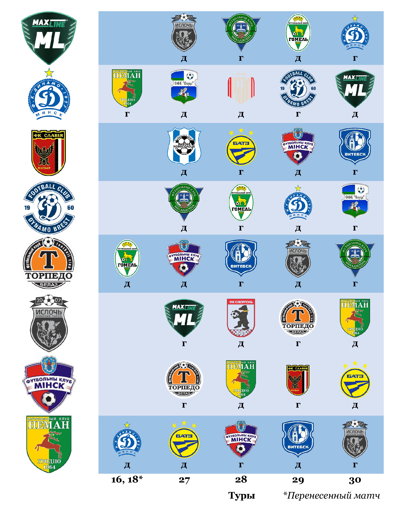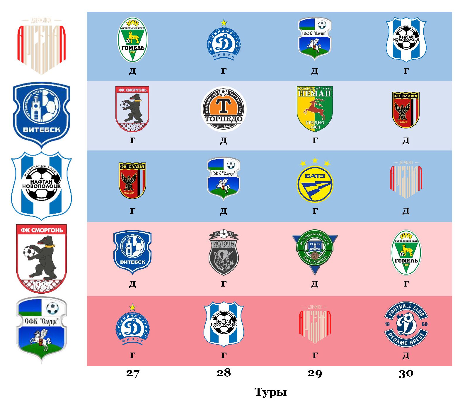 За золото с «МЛ Витебск» продолжает бодаться минское «Динамо». Математически шансы на чемпионство сохраняет и «Славия», но более реально в Мозыре мечтать о втором месте и проходе в еврокубковую квалификацию. Правда, плотность в верхней части таблицы высокая — и далеко не факт, что команде Ивана Биончика в принципе удастся удержаться в тройке. Посмотрим, кому с кем предстоит сыграть в решающей фазе («д» — дома, «г» — в гостях).