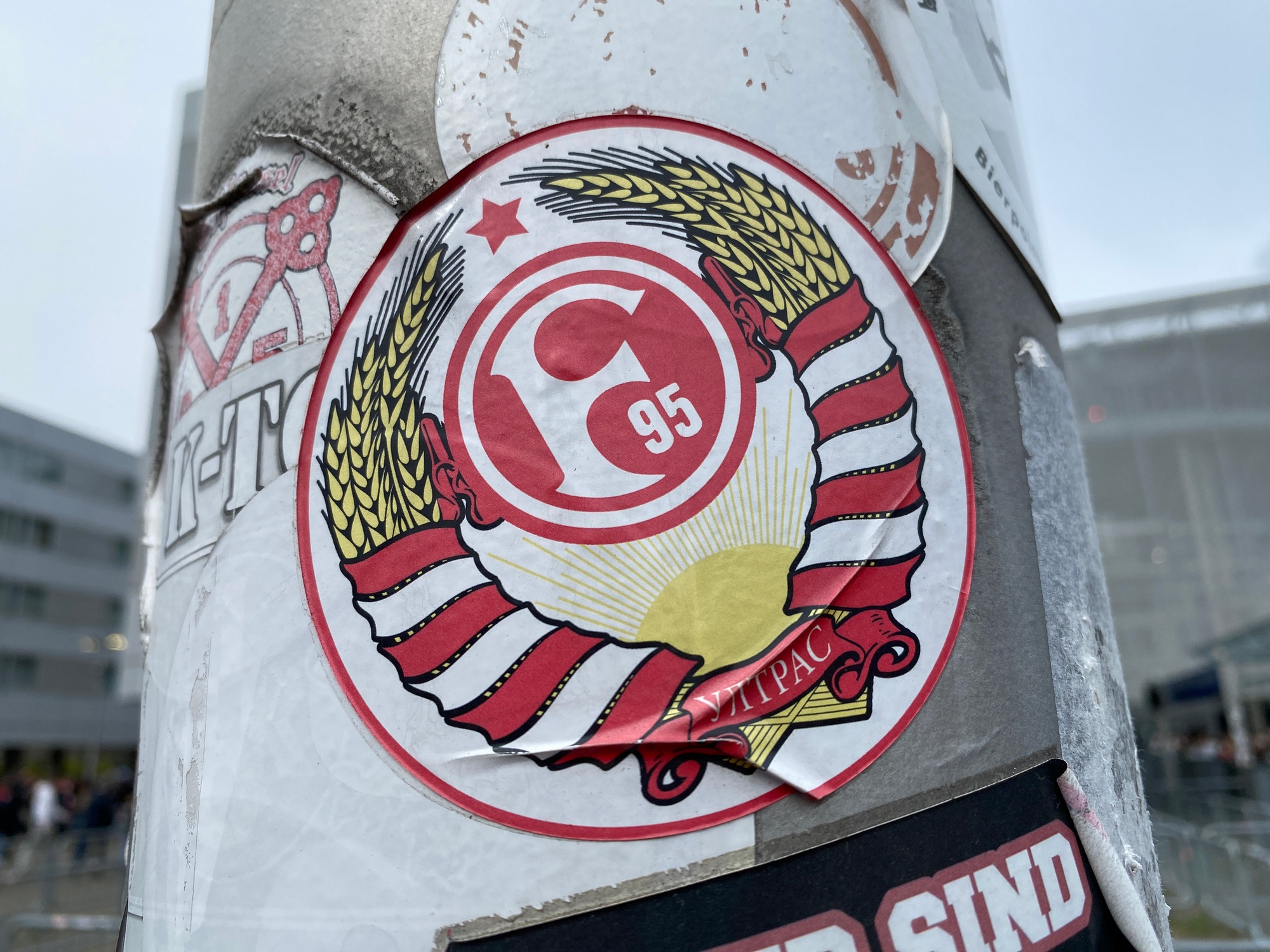 Фанатские стикеры — целая вселенная. «Ультрас» лихо работают со всеми культурными слоями. Порой референс трудно понять иностранцам вроде нас. А иногда — наоборот. Вот вам пример из Дюссельдорфа от местной «Фортуны». Не знаю, насколько это понятно немцам, особенно западным, но любой человек, рожденный в СССР, понимает, что к чему. «УЛТРАС» заморочились даже с кириллицей, за что им отдельный «данке шен».