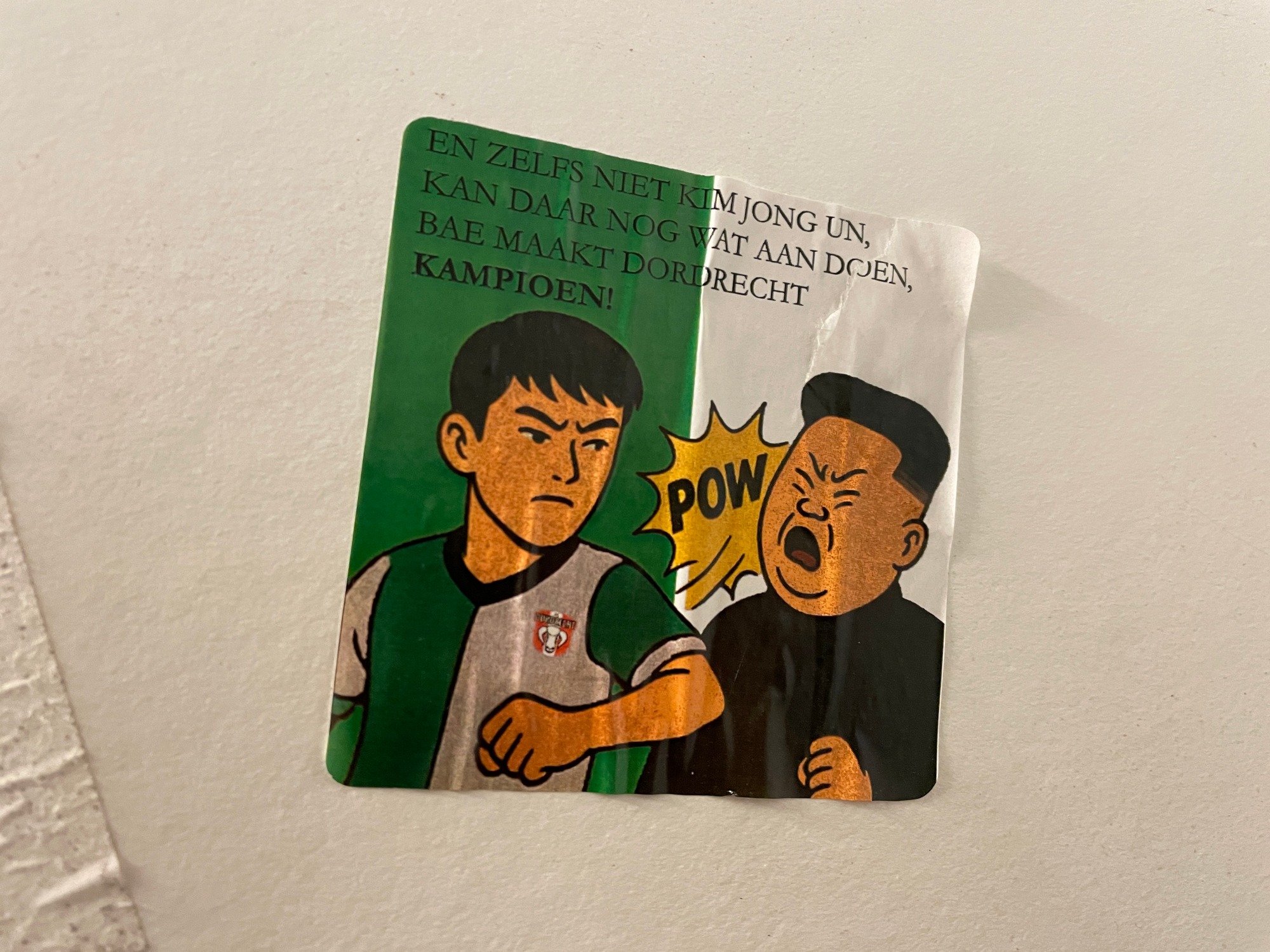 Стикер из туалета арены «M-Scores» в Дордрехте. Стихотворение с нидерландского переводится примерно так: «Даже Ким Чен Ын ничего не может с этим поделать! Бэ сделает «Дордрехт» чемпионом!»