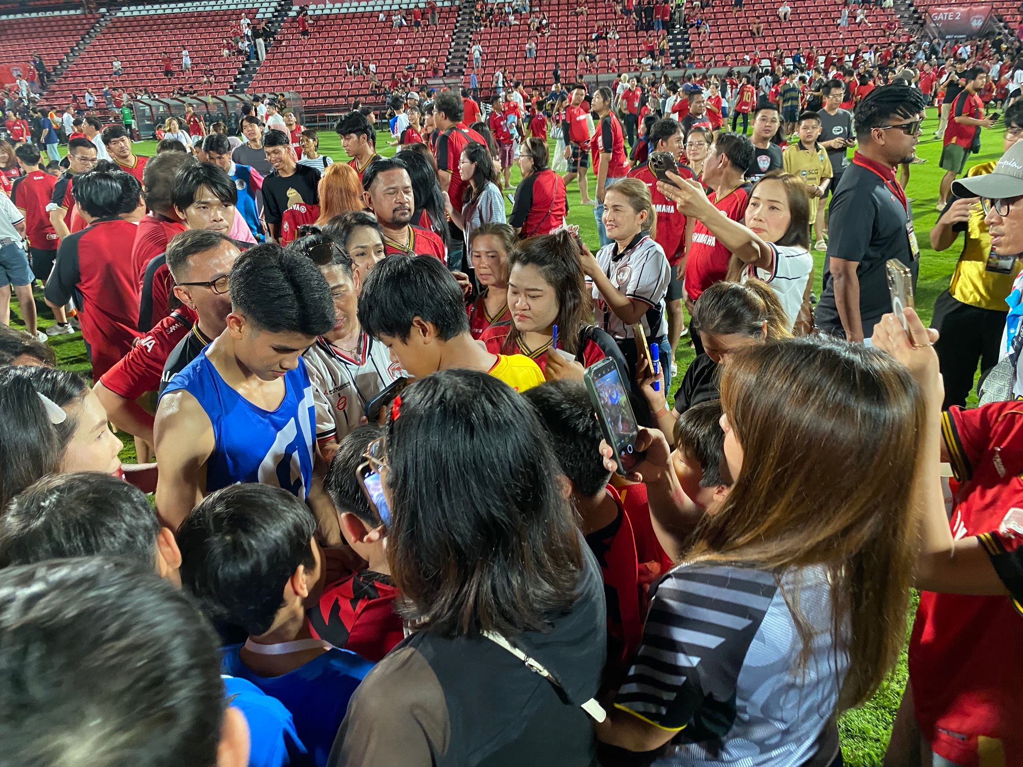 Матч прибангкокского «Муангтонг Юнайтед» и «Накхонратчасимы» был последним в сезоне для обеих команд, ничего особо не решал и прошел в умеренно бескомпромиссной борьбе. Самое яркое событие случилось после финального свистка. Стюарды открыли калитки и санкционировали мощный pitch invasion — выбегание болельщиков на поле.