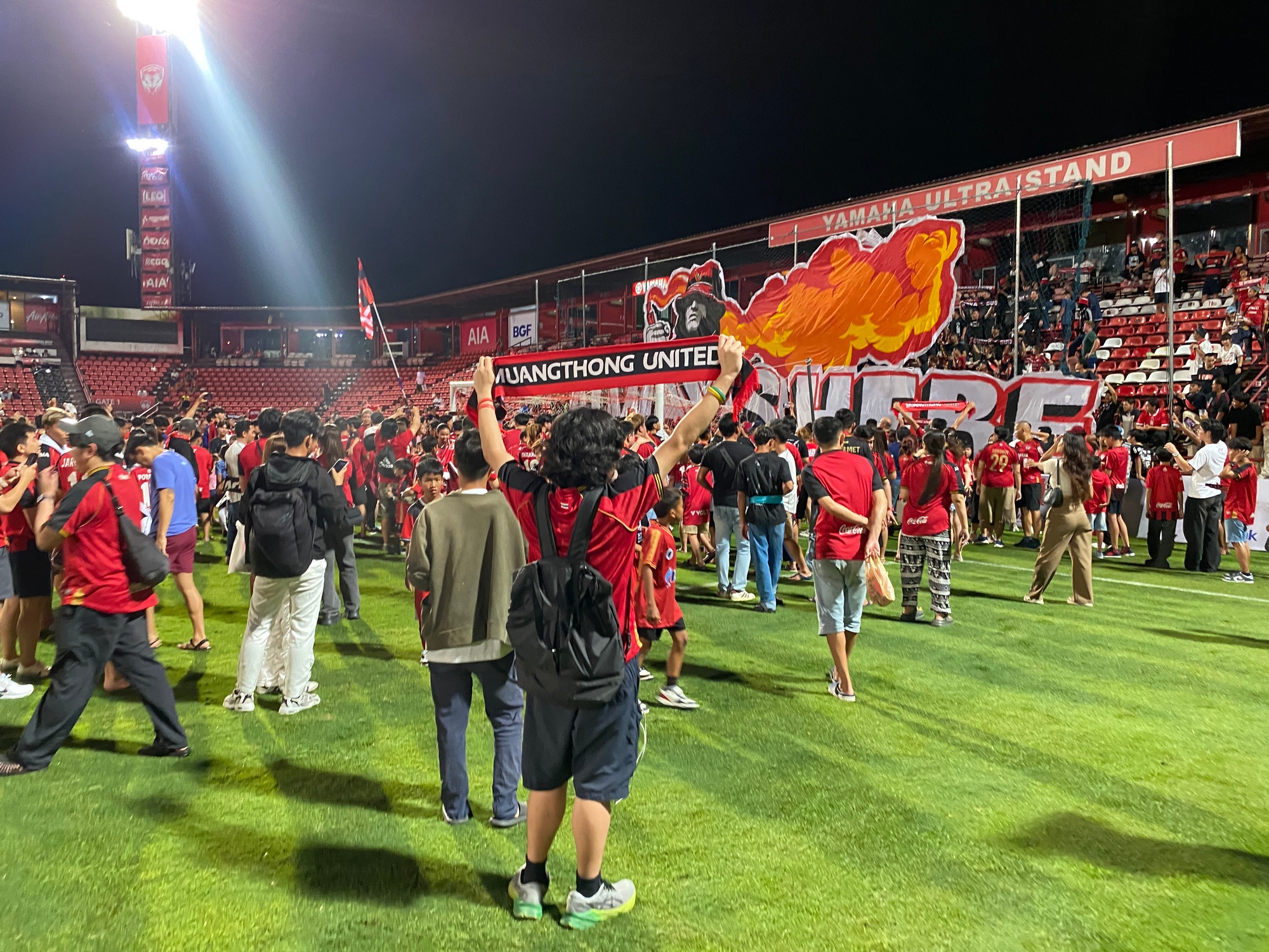 Праздник был на ровном месте. «Муангтонг Юнайтед» в таблице шестой, что для клуба, который четырежды за последние 15 сезонов брал чемпионство, не ахти какой результат. И все-таки взрослые радовались, как дети, а дети — как взрослые. Радовались стадионным свободе, равенству и братству. Болельщики обнимались и фотографировались с футболистами на поле, а потом подошли к сектору, который устроил перформанс специально для них.