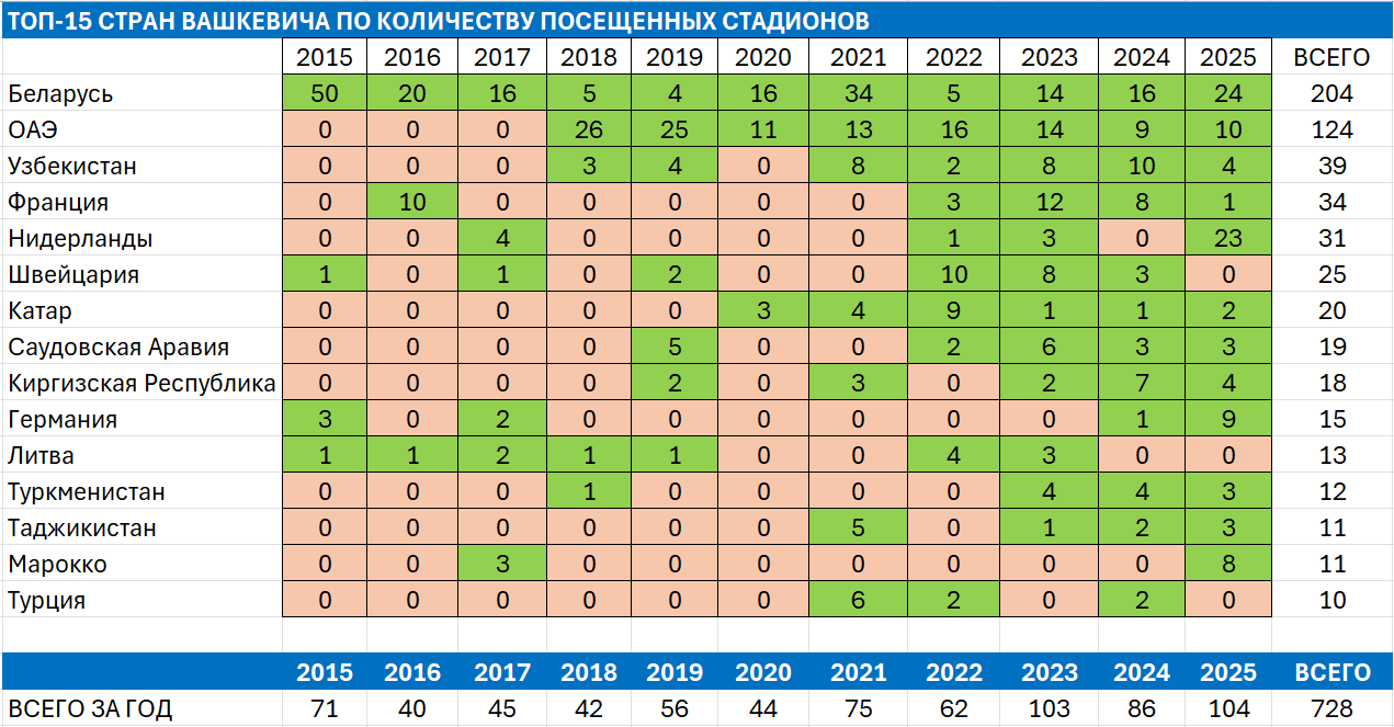 Экс-генсек БАТЭ Андрей Вашкевич продолжает гоняться за новыми стадионами по всему миру. В 2025-м он посетил матчи на 104 новых аренах. Тем самым борисовчанин зафиксировал новый личный рекорд: предыдущий, установленный в 2023-м, равнялся 103. Для этого достижения ему потребовалось всего 138 матчей в 66 различных турнирах в 17 странах на трех континентах. Специально для pressball.by легендарный белорусский граундхоппер нарезал хайлайты своих впечатлений.