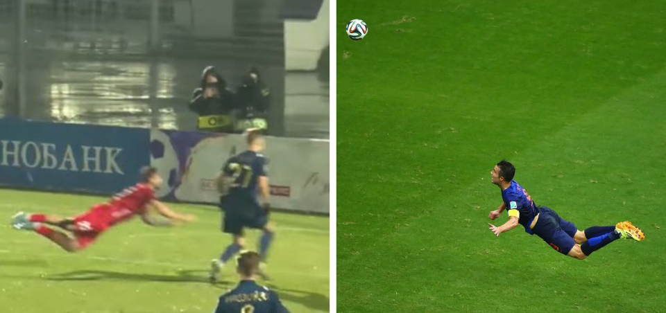Робин ван Перси изумительно попал в ворота сборной Испании на ЧМ-2014, в 2025-м чуть менее грандиозный акробатический этюд удался Александру Макасю в матче против «Сморгони».