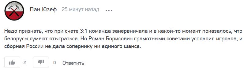 — Хотелось бы поздравить сборную России, не РоРо. Победа есть победа, но непонятно лишь, почему белорусы не играли, просто отбывали номер. Уж очень явно видно было отсутствие желания играть.