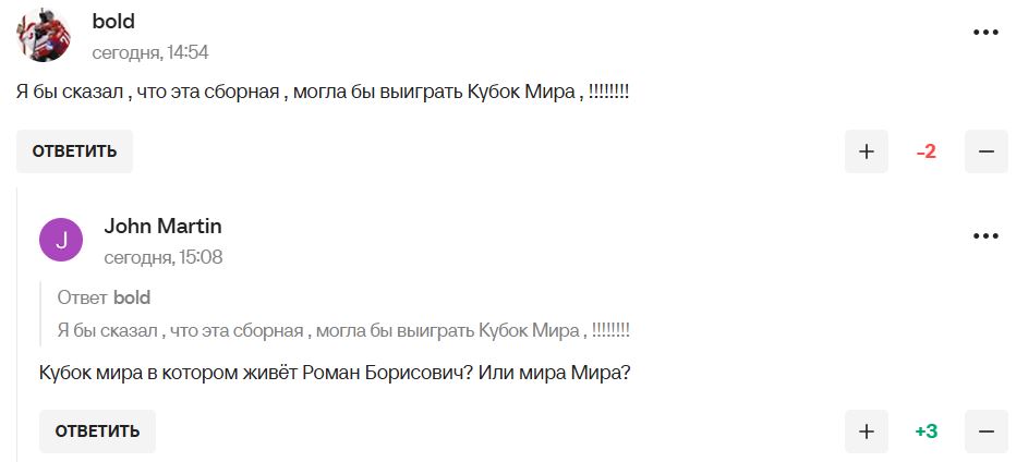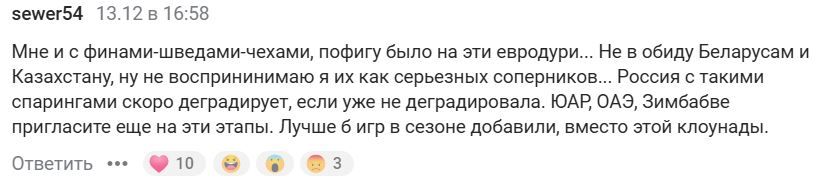 — Мне и с финнами-шведами-чехами, пофигу было на эти евродури… Не в обиду белорусам и Казахстану, ну не воспринимаю я их как серьезных соперников… Россия с такими спаррингами скоро деградирует, если уже не деградировала. ЮАР, ОАЭ, Зимбабве пригласите еще на эти этапы. Лучше б игр в сезоне добавили вместо этой клоунады.