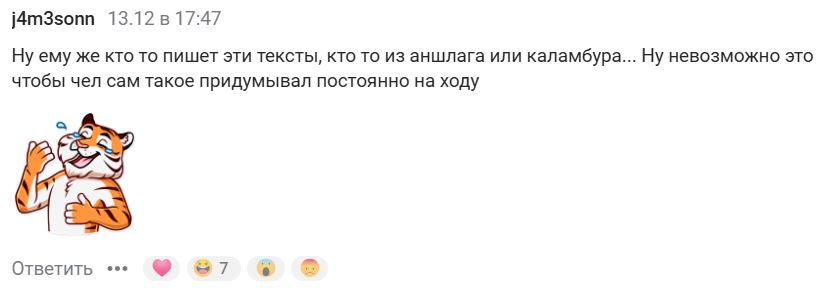 — Ну ему же кто-то пишет эти тексты, кто-то из «Аншлага» или «Каламбура»… Ну невозможно это, чтобы чел сам такое придумывал постоянно на ходу.