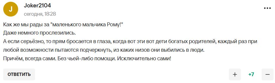 — Как же мы рады за «маленького мальчика Рому!» Даже немного прослезились. А если серьезно, то прям бросается в глаза, когда вот эти вот дети богатых родителей каждый раз при любой возможности пытаются подчеркнуть, из каких низов они выбились в люди. Причем всегда сами, без чьей-либо помощи. Исключительно сами!