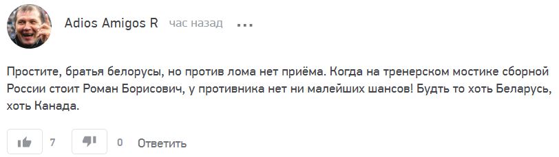 — Простите, братья белорусы, но против лома нет приема. Когда на тренерском мостике сборной России стоит Роман Борисович, у противника нет ни малейших шансов! Будь то хоть Беларусь, хоть Канада.