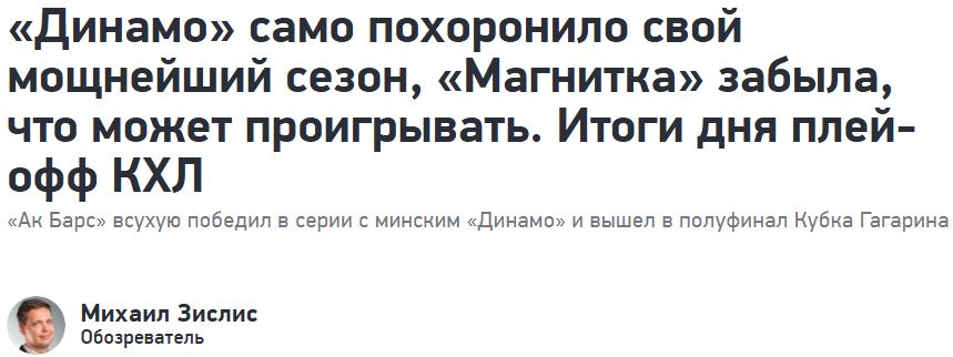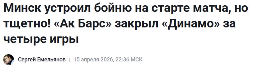 — «Ак Барс» с победой! И правда молодцы, раскатали Минск. Есть такие люди, которые не для побед в плей-офф. Такие, как Шипачев, Гусев. В «регулярке» они набирают прилично очков, но как только матчи на выбывание, то сдуваются ребята. Не бойцы, скажем так.