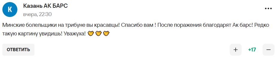 — Минские болельщики на трибуне, вы красавцы! Спасибо вам! После поражения благодарят «Ак Барс»! Редко такую картину увидишь! Уважуха!