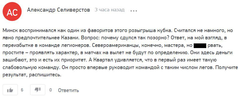 — Минск воспринимался как один из фаворитов этого розыгрыша Кубка. Считался ненамного, но явно предпочтительнее Казани. Вопрос: почему сдулся так позорно? Ответ, на мой взгляд, в переизбытке в команде легионеров. Североамериканцы, конечно, мастера, но **** рвать, простите, проявлять характер в матчах навылет не будут по определению. Они здесь деньги зашибают, это и есть их приоритет. А Квартал удивляется, что в первый раз имеет такую слабовольную команду. Он просто впервые руководит командой с таким числом легов. Получите результат, распишитесь.