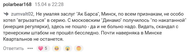 — Не фанат казанцев (даже скорее наоборот), но в этой серии все так, как и должно быть. Я не знаю, кто эти люди, которые там мысленно уже минчанам КГ вручали. Даже отлет «Салавата» «всухую» не так по делу, как эта серия. На льду были команды разного класса. Удачи минчанам в дальнейшем… Ну и болелам их пыл бы поумерить.