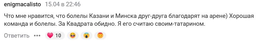 — Что мне нравится, что болелы Казани и Минска друг друга благодарят на арене. Хорошая команда и болелы. За Квадрата обидно. Я его считаю своим — татарином.