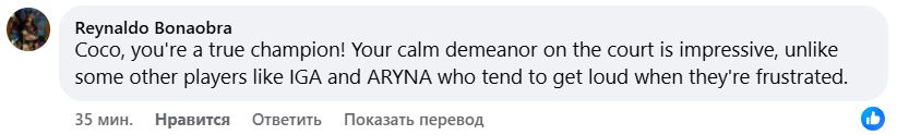 — Коко, ты настоящий чемпион! Твое спокойное поведение на корте впечатляет в отличие от некоторых других игроков, таких как Ига и Арина, которые, как правило, начинают голосить, когда расстроены.
