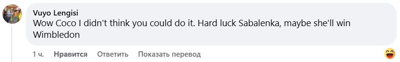 — Ого, Коко, я не думала, что ты сможешь это сделать. Не повезло Соболенко, может, она выиграет Уимблдон.