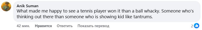 — Этот вид спорта настолько несерьезен с точки зрения профессиональных лиг. «Профессионал» чуть не запустил мяч и не попал в ребенка, бросившего его, а затем сам закатил истерику, как пятилетний ребенок. Вся эта драма от Соболенко… Хотя мне 16 (играю в футбол в старшей школе), у меня гораздо больше атлетизма, чем у Соболенко. Честь и хвала Гауфф за то, что она действительно уважаемый спортсмен и одержала нелегкую победу.