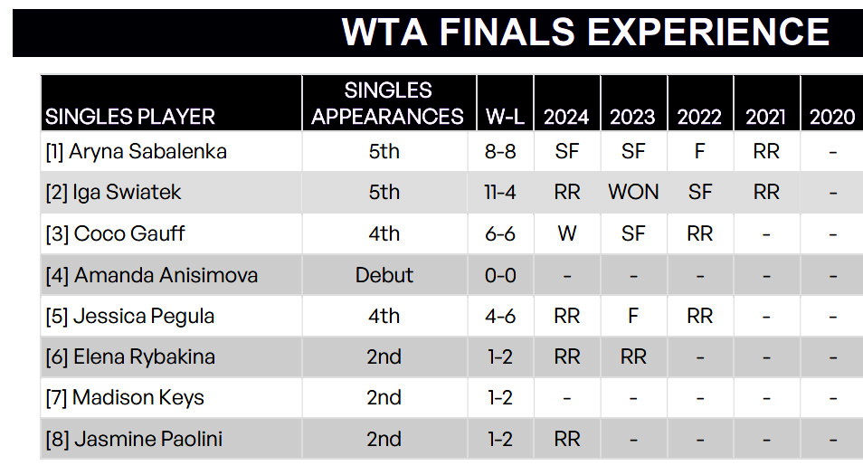 В отличие от принципов построения турниров ВТА, заявочный список на итоговый турнир «закрытый». Здесь нет ни раунда квалификации, ни традиционного посева. В Эр-Рияд приглашаются восемь лидеров «Чемпионской гонки», набравшие максимальное количество очков в сезоне.