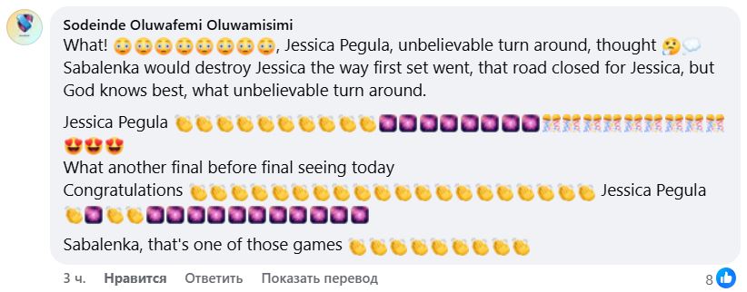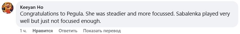 — Поздравляю Пегулу. Она была увереннее и собраннее. Соболенко играла очень хорошо, но ей просто не хватало концентрации.