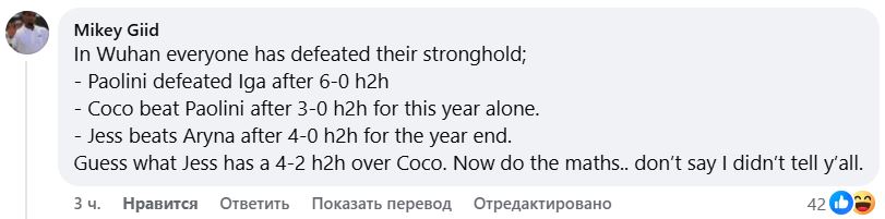 — В Ухане все взяли свои «неприступные крепости»: Паолини победила Игу после счета 0-6 в личных встречах; Коко победила Паолини после 0-3 по личным встречам в этом году; Джесс победила Арину после счета 0-4 в последних личных встречах.