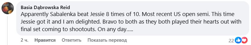 — Вроде Соболенко обыграла Джесси 8 раз из 10. Последний раз — в полуфинале US Open. Сейчас Джесси добилась своего, и я в восторге. Браво обеим, потому что выкладывались на полную катушку, когда дело дошло до перестрелки в финальном сете.
