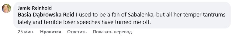 Ответ: Раньше я была поклонницей Соболенко, но все ее недавние истерики и ужасные речи после неудач оттолкнули меня.