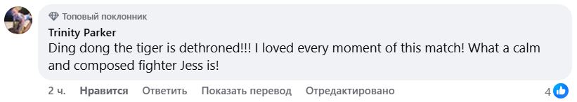 — Дин-дон, тигр свергнут!!! Мне понравился каждый момент этого матча! Какой спокойный и хладнокровный боец Джесс!