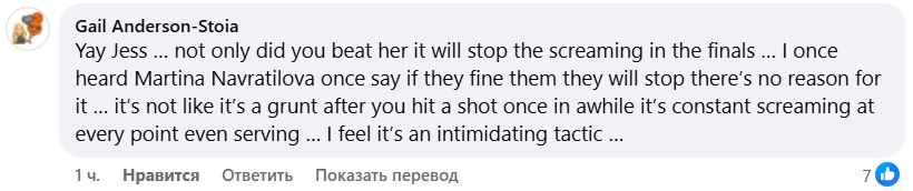 — Ура, Джесс… Ты не только победила ее, но и предотвратила крики в финале. Я как-то слышала, как Мартина Навратилова сказала, что если их штрафовать, они прекратят, ведь для этого нет причин… Это не визг после того, как ты время от времени наносишь удар, это постоянный крик на каждом этапе, даже при подаче… Мне кажется, это тактика запугивания.