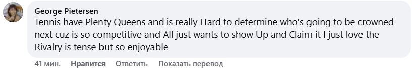 — В теннисе много королев, и очень сложно определить, кто будет коронован следующей, потому что конкуренция очень высокая и все хотят показать себя и заявить о себе. Мне просто нравится, что соперничество напряженное, но такое увлекательное.