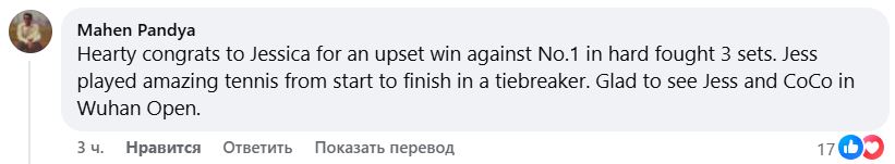 — От всей души поздравляю Джессику с неожиданной победой над первой ракеткой мира в упорной борьбе за три сета. Джесс показала потрясающий теннис от начала до конца на тай-брейке. Рада видеть Джесс и Коко на турнире в Ухане.