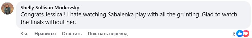 — Поздравляю, Джессика! Терпеть не могу смотреть, как Соболенко играет со всем этим визгом. Рада смотреть финалы без нее.
