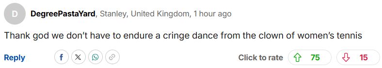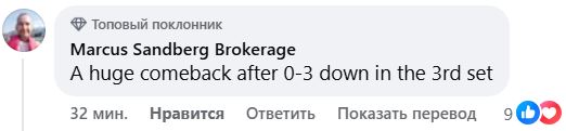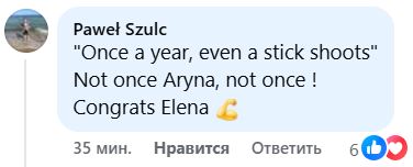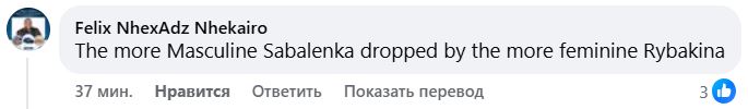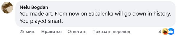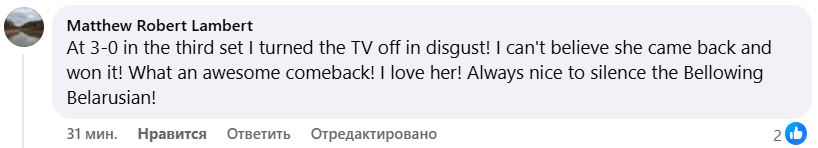 — При счете 3:0 в третьем сете я с отвращением выключил телевизор! Не могу поверить, что она вернулась и выиграла! Какой потрясающий камбэк! Я ее обожаю! Всегда приятно заставить замолчать ревущую белорусскую теннисистку!