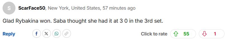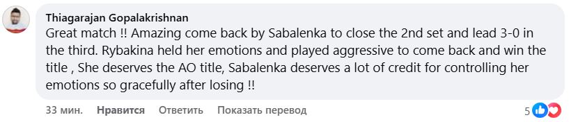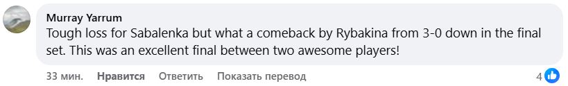 — Тяжелое поражение для Соболенко, но какой камбэк Рыбакиной с 0:3 в финальном сете. Это был отличный финал между двумя замечательными игроками!