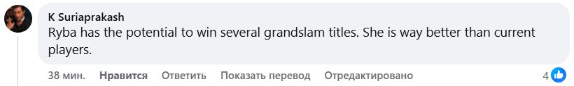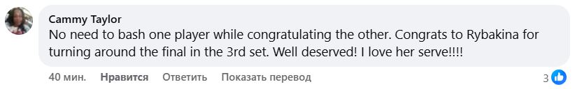 — Нет необходимости критиковать одного игрока, поздравляя при этом другого. Поздравляю Рыбакину с тем, что она переломила ход финала в третьем сете. Заслуженная победа! Мне очень нравится ее подача!!!