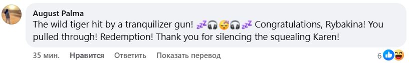 — Дикую тигрицу свалили транквилизатором! Поздравляю, Рыбакина! Ты выжила! Спасение! Спасибо, что заставила замолчать визжащую Карен (отсылка на мем с криками. — Прим.)!