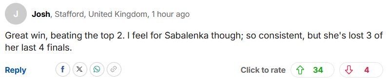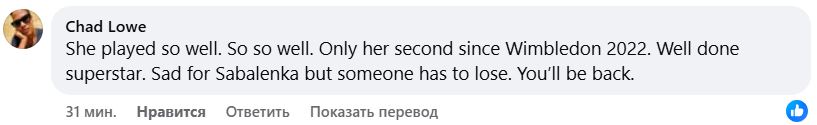 — Отличная победа, битва двух лучших. Мне жаль Соболенко: она так стабильно играет, но уступила в трех из последних четырех финалах.