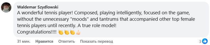 — Замечательная теннисистка! Спокойная, играет умно, сосредоточена на игре, без лишних «перепадов настроения» и истерик, которые до недавнего времени сопровождали других ведущих теннисисток. Настоящий образец для подражания! Поздравляем!!!