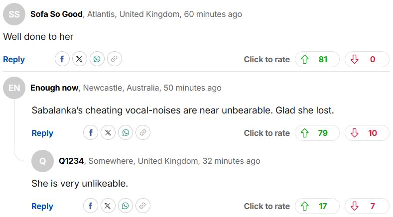 Ответ: Читерские голосовые излияния Соболенко почти невыносимы. Рада, что она проиграла.
