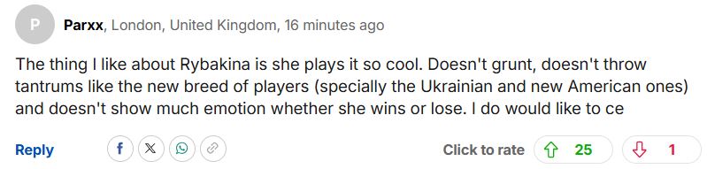 — Что мне нравится в Рыбакиной, так это ее хладнокровие. Она не визжит, не устраивает истерики, как новое поколение теннисисток (особенно украинки и американки), и не проявляет особых эмоций независимо от того, выигрывает она или проигрывает. Всем бы так…