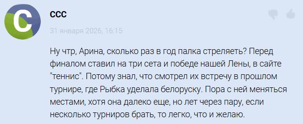 «Раз в год и палка стреляет, бл***», — в сердцах выдала Арина Соболенко под камерами после поражения от Елены Рыбакиной в финале Итогового турнира ВТА в Эр-Рияде — 3:6, 6:7.